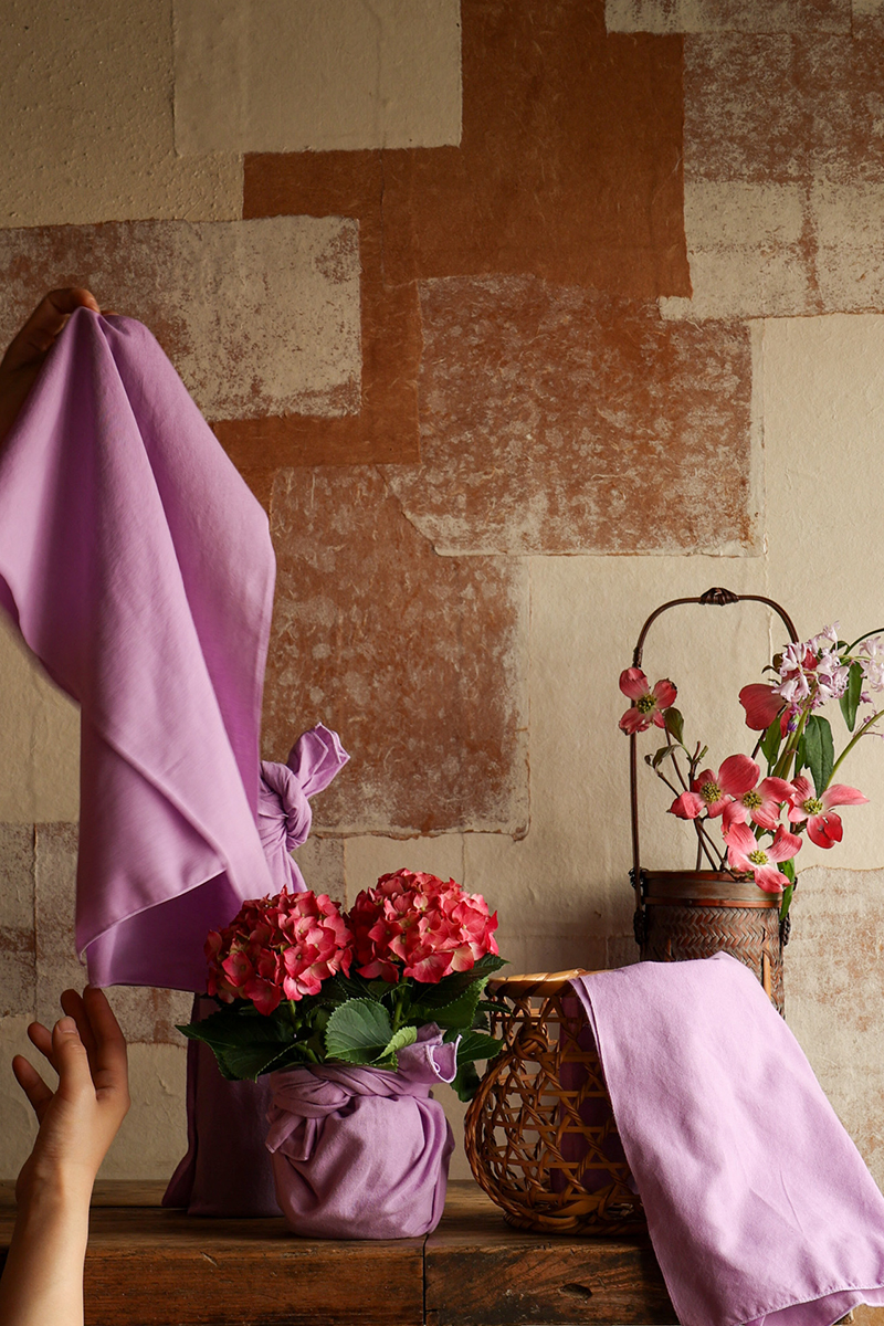 花屋リトルの営みの中で生まれた、草花の端材を染料にし、やさしい自然の色を布に映したファブリックアイテムたち。ボタニカルダイという特別な技法は、媒染剤を使わず、植物の天然色素に微量の化学染料を加えることで、自然な発色と色落ちのしにくさを両立しています。草木染めを現代の暮らしに寄り添わせ、植物を暮らしの中に取り入れる新たな提案が魅力です。